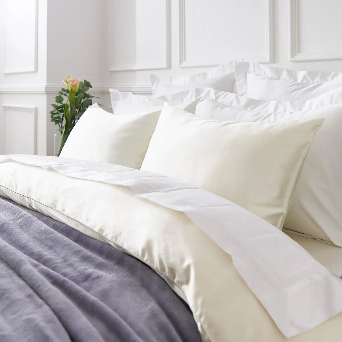 要素を減らしミニマムにピローケースや掛け布団カバーに飾りをつけず、よりスタイリッシュなコーディネートを志向しました。カラーリングは仄かに温かみのあるアイボリー。モダンな空間に調和する、控えめな明るさが魅力の色調です。