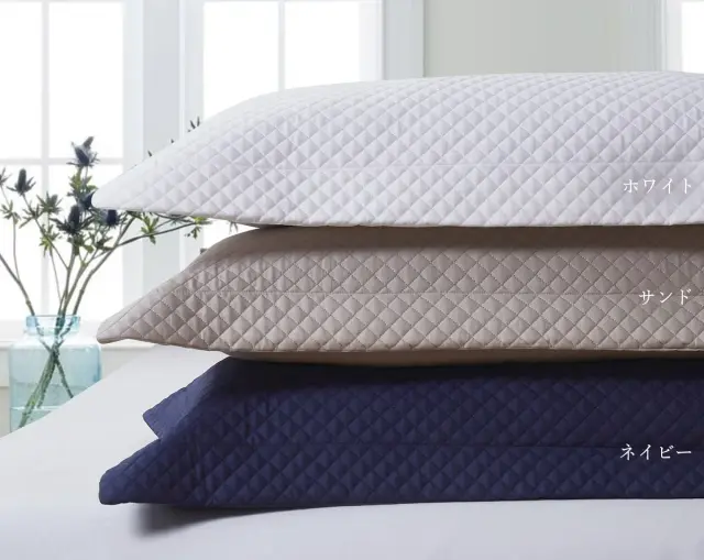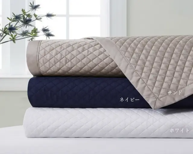 高級シーツにも使用される高密度な超長綿を贅沢に織りなしたキルティング生地。ベッドカバー、ソファーカバー、ベッドライナー、クッションカバーを取り揃えました。艷やかな光沢がどのようなスタイルのお部屋でもマッチし、コーディネイトに表情を加えます。