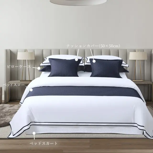 ラグジュアリーホテルのベッドに多い、ベージュ、ネイビーなどお部屋に取り入れやすいシックなカラーをアクセントとして取り入れる事で表情が生まれて、洗練された印象になります。