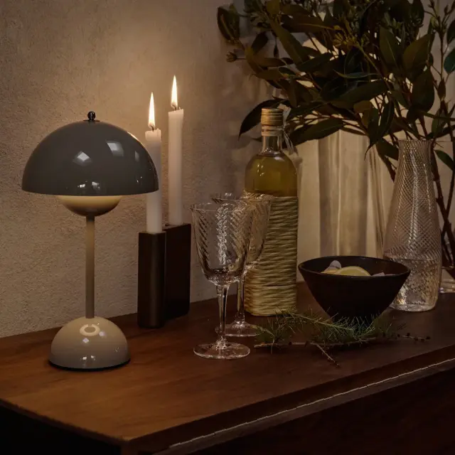 ポータブルランプであるVP9は、フラワーポットのテーブルランプタイプよりも少し小さく、意図的に軽量に設計され、電源はUSB充電ケーブルを採用しています。