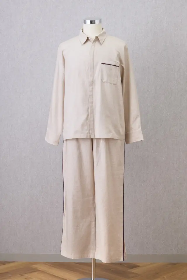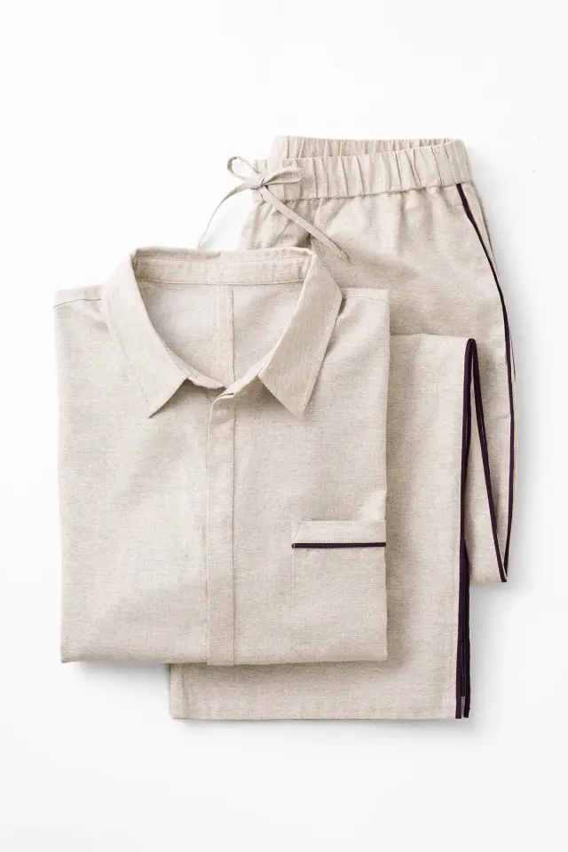 ベーシックなカラーリングに、さりげないディテールで遊び心を落とし込んだテーラードパジャマ。