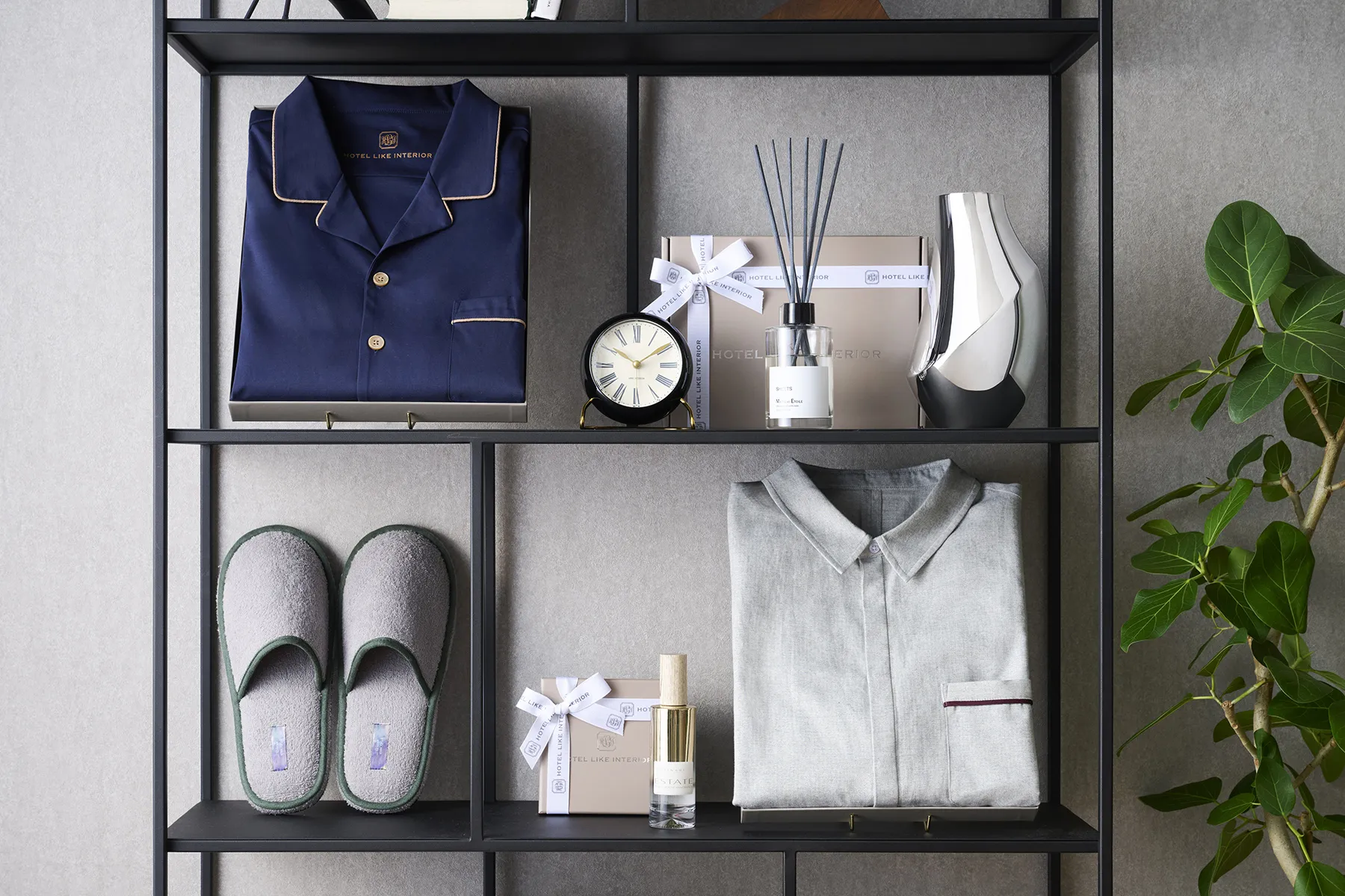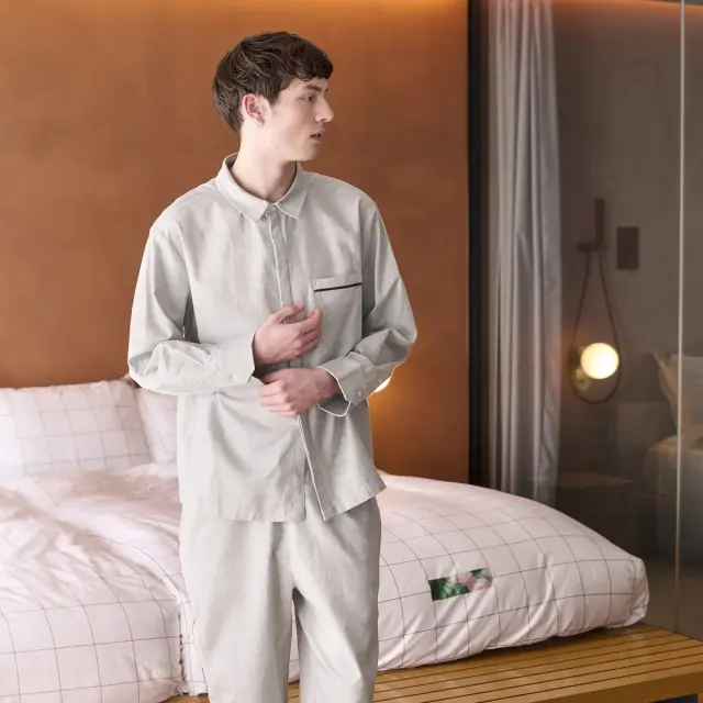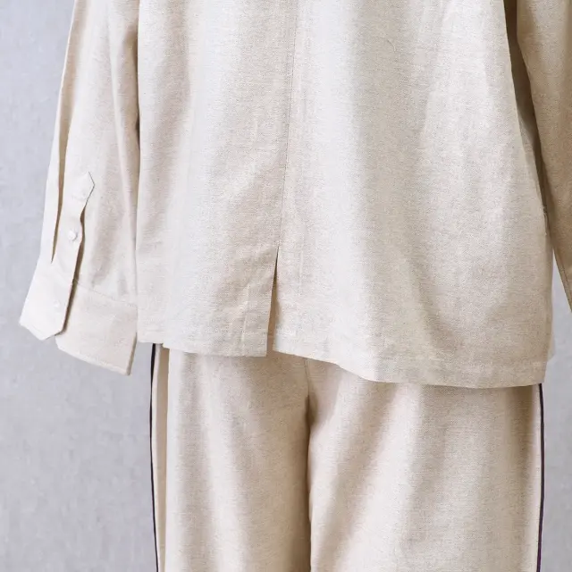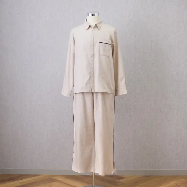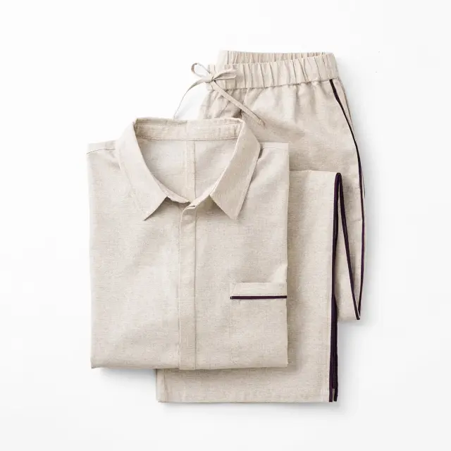ベーシックなカラーリングに、さりげないディテールで遊び心を落とし込んだテーラードパジャマ。