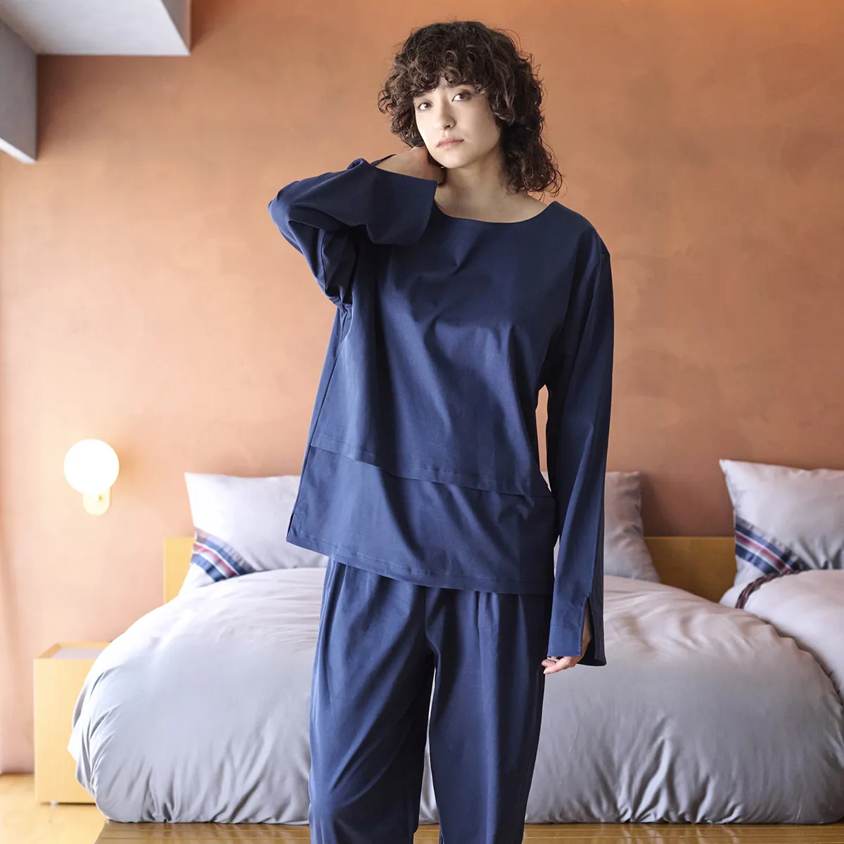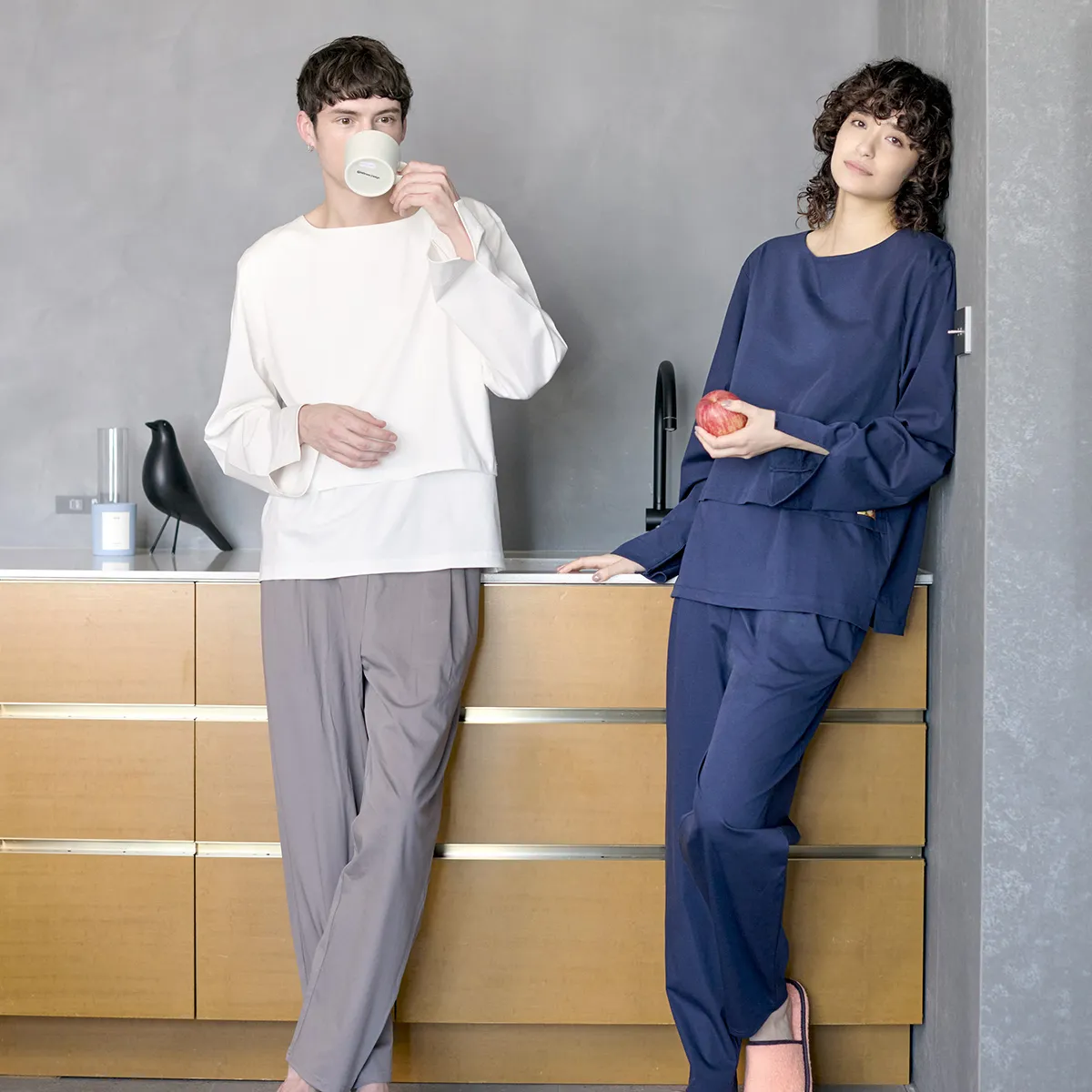 ボートネックのカットソーとテーパードパンツを、ジャージー生地で仕立てたルームウェアセット。