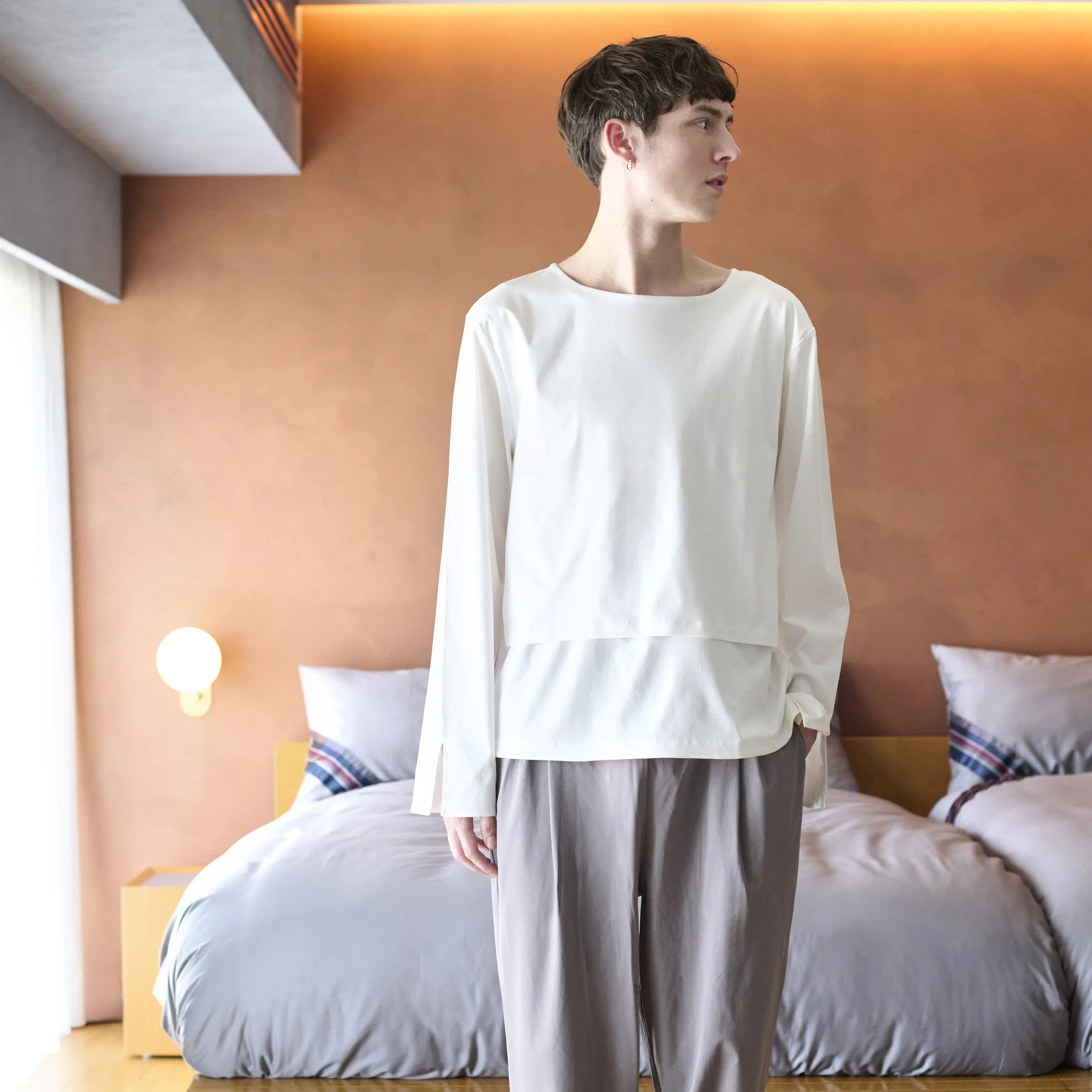 程よく開いたボートネックは、首元の煩わしさを最小限に。朝の新鮮な空気が鎖骨に触れる心地よさのための仕様です。