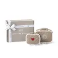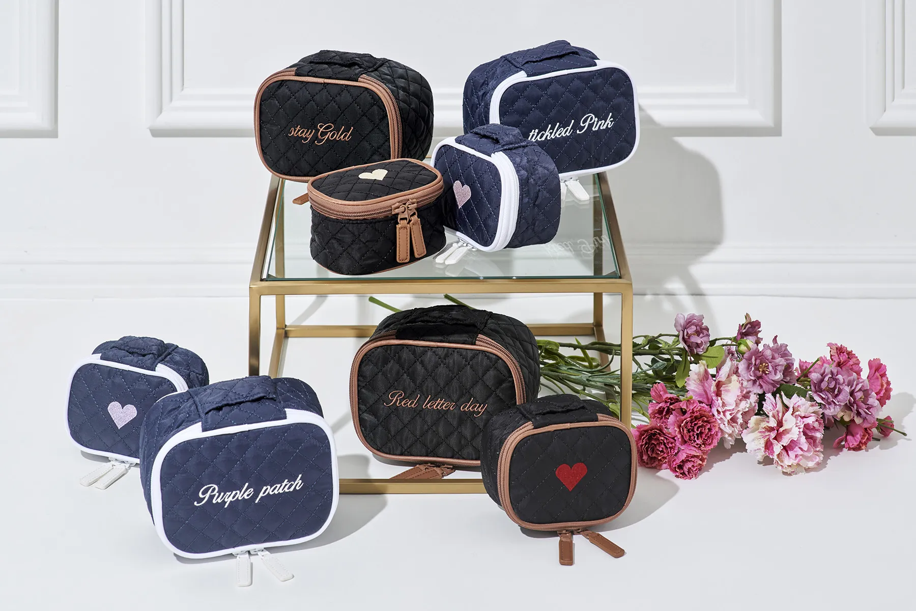 miniサイズ・Sサイズの2セットミニサイズ(W12×D9×H7cm)・スモールサイズ(W16×D11×H9cm)の2セットは、毎日のバッグの中に潜ませたいデイリーユースサイズ。ミニサイズにはカラーのハートを、スモールサイズにはそのカラーにちなんだメッセージを刺繍しました。