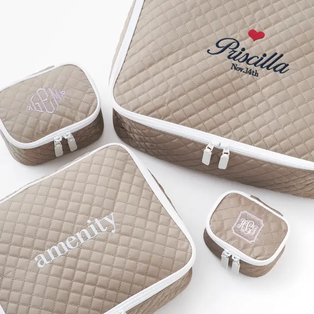 旅行時のパッキングや、普段遣いのバッグの整理整頓に重宝するポーチのセットは贈り物に最適です。刺繍を入れてオリジナリティを加えれば、なお一層愛着の沸く特別なアイテムに。