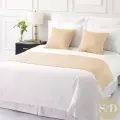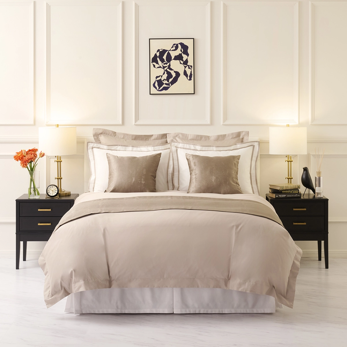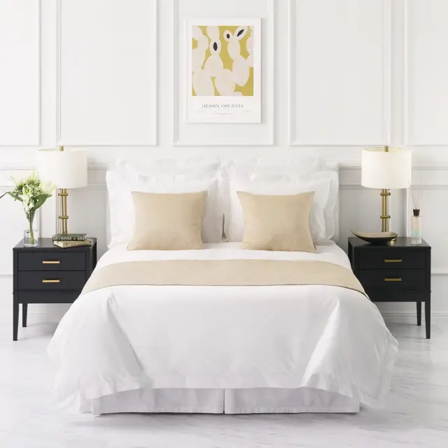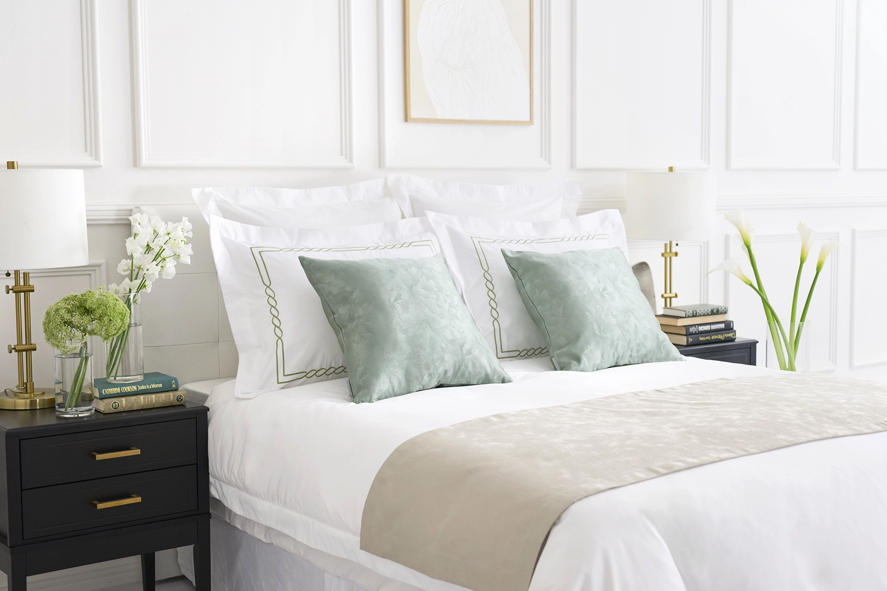 清潔感のあるホワイト色のシンプルなシーツに、ベッドスローで光沢感やアクセントとなるカラーを取り入れることで、端正なホテルスタイルに。