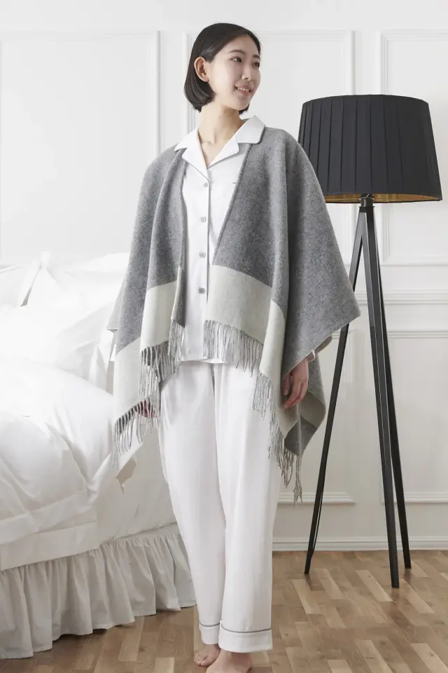 やわらかな肌触りが魅力のラムウールを贅沢に使用したポンチョは、室内でも屋外でもマルチに活躍。