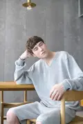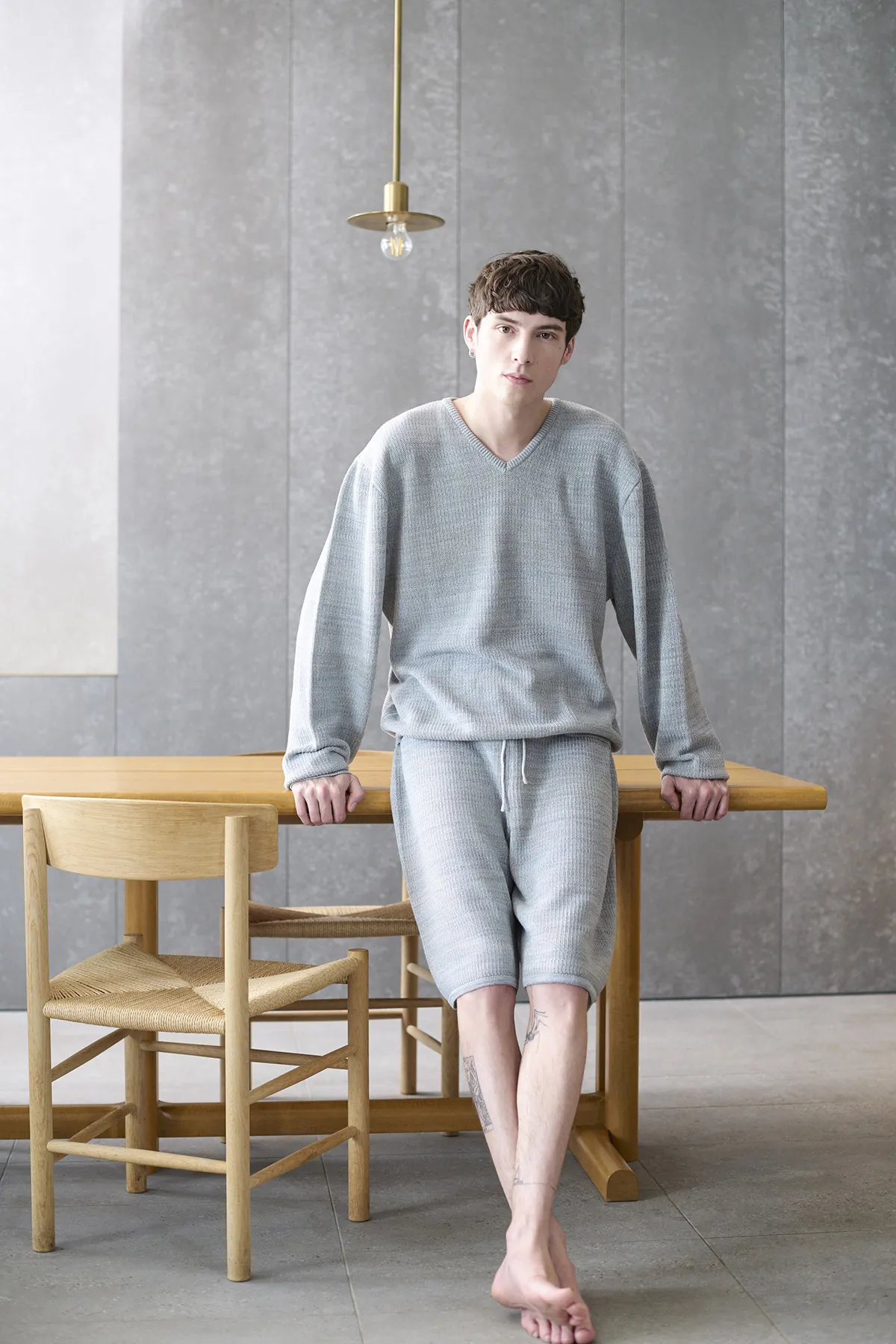同じ色合いのニット生地を、編み方を変えながらルームウェアとブランケットに仕立てました。