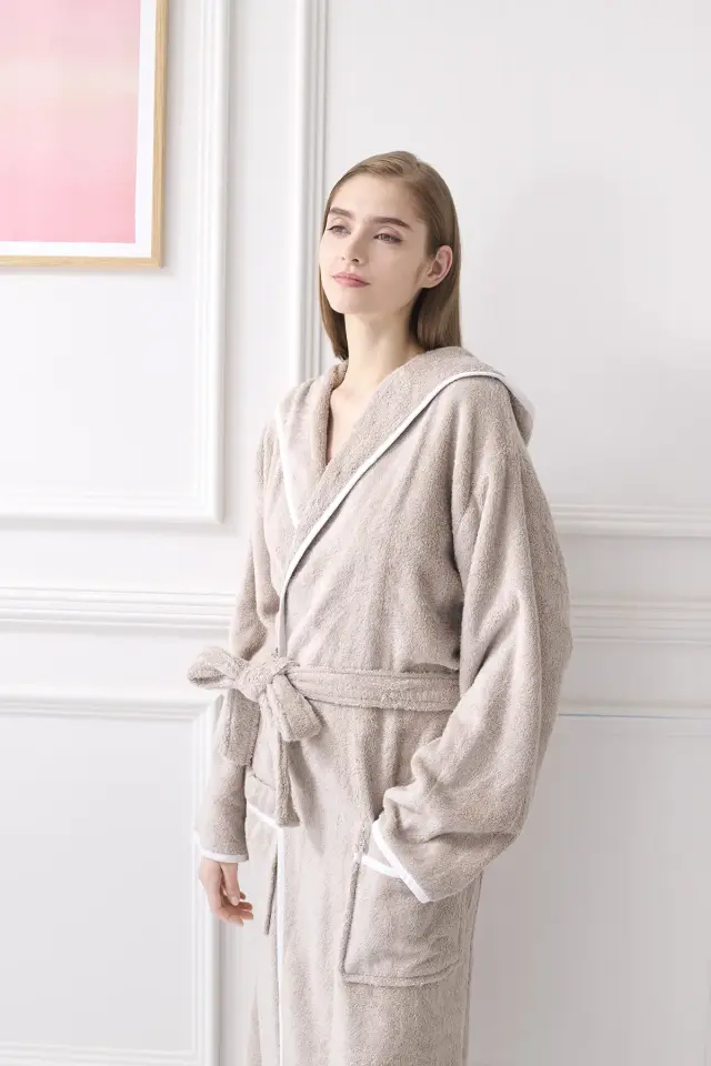 竹を原料に使用したレーヨンと、トルコ産超長綿の混合生地です。 レーヨンはコットンをも凌ぐ吸水性・発散性を誇り、濡れた身体の上に直接羽織るバスローブに最適の素材です。