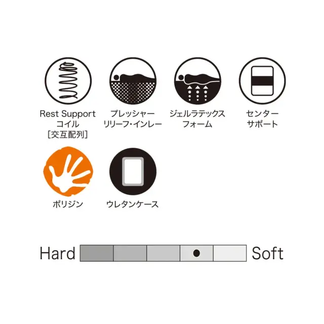 | クッション層 | 化繊綿、スーパーソフトウレタン、プロファイルウレタン、抗菌不織布、中マチ用生地、中反発プロファイルウレタン、5ゾーン・プレッシャーリリーフ・インレー、 ウレタン+硬質フェルト(センターサポート)、ニューハードフェルト |