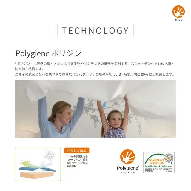 天然の銀イオンにより微生物やバクテリアの繁殖を抑制する、スウェーデン生まれの抗菌・防臭技術。 ニオイの原因となる黄色ブドウ球菌などのバクテリアの繁殖を抑え、24時間以内に99%以上抗菌します。