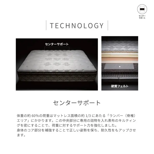 更に、ランバー(脊椎)エリアには2層の詰め物を入れ、荷重に対するサポート力を強化する「センターサポート」を配し、身体のコア部分を補強することで正しい寝姿勢を保ちます。