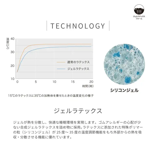 ラテックス素材に添加された特殊ポリマーの粒(シリコンジェル)が25〜35度の温度調節機能を持ち、外部からの熱を吸収・分散させる機能に優れています。