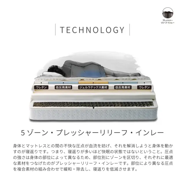 身体の部位別にゾーンを区切り、それぞれに最適な素材を組み合わせ、部位により異なる圧点を緩和、除去して寝返りを低減します。 (頭から肩の部分には低反発素材を、荷重の大きい腰から尻の部分にはジェルラテックス素材を、脚の部分には低反発素材を使用。)