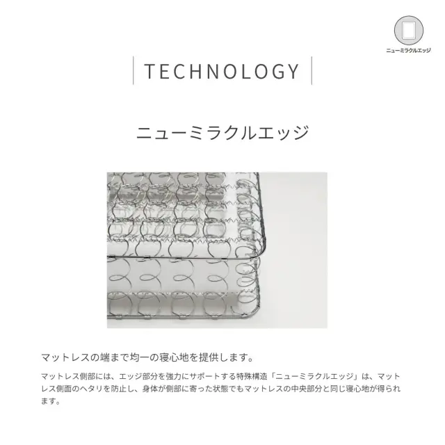 マットレス側部には、エッジ部分を強力にサポートする特殊構造「ニューミラクルエッジ」が施されております。 マットレス側面のヘタリを防止するとともに、身体が側部に寄った状態でもマットレスの中央部分と同じ寝心地が得られます。 使用感がいつまでも損なわれない、シーリー独自の研究から生まれた仕様です。