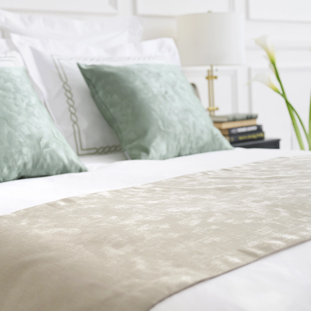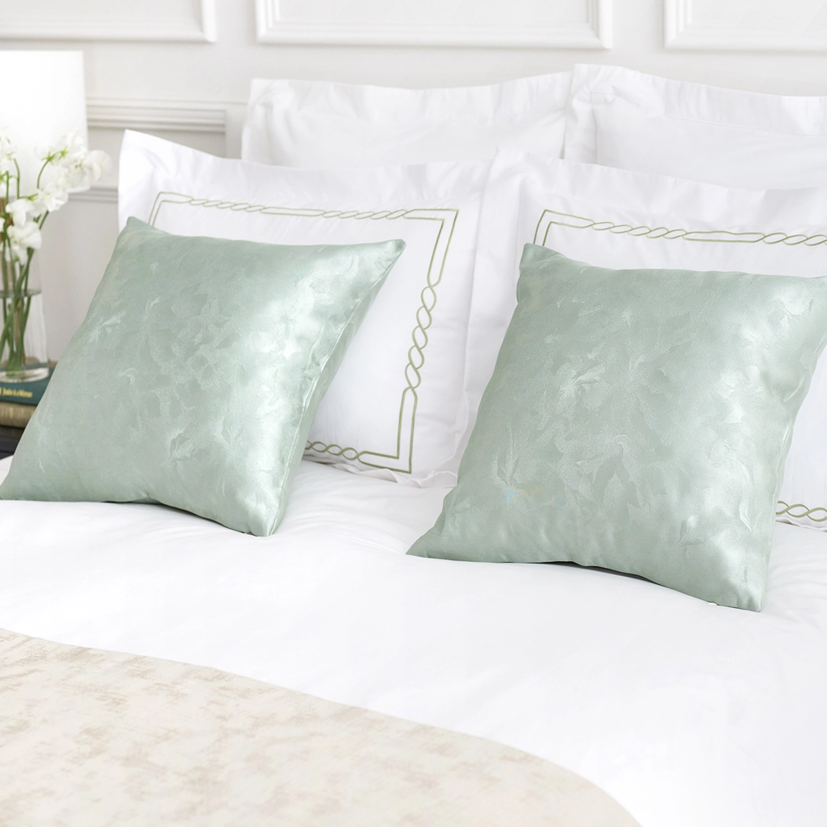 古代ギリシャのモチーフからインスパイアされたチェーンのステッチが、寝室をノーブルに、格式高く彩ります。
