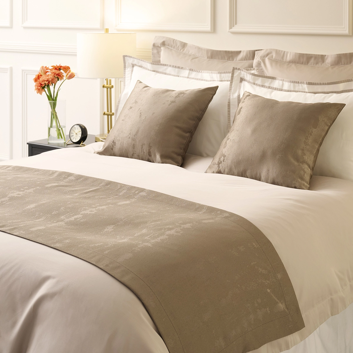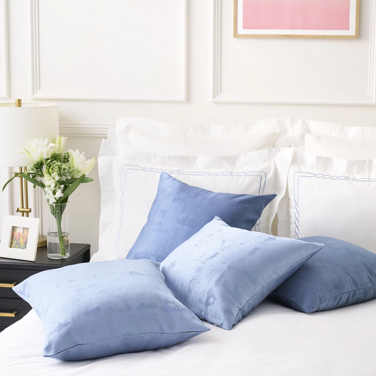 寝室だけでなく、リビングルームのソファーやチェアーにデコラティブに飾って、ラグジュアリーホテルのような空間に。